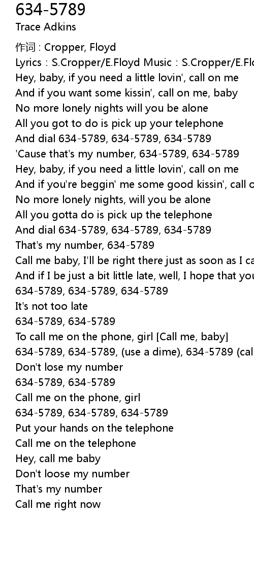 | 634-5789, 634-5789, (use a dime), 634-5789 (call me up, hey) | |