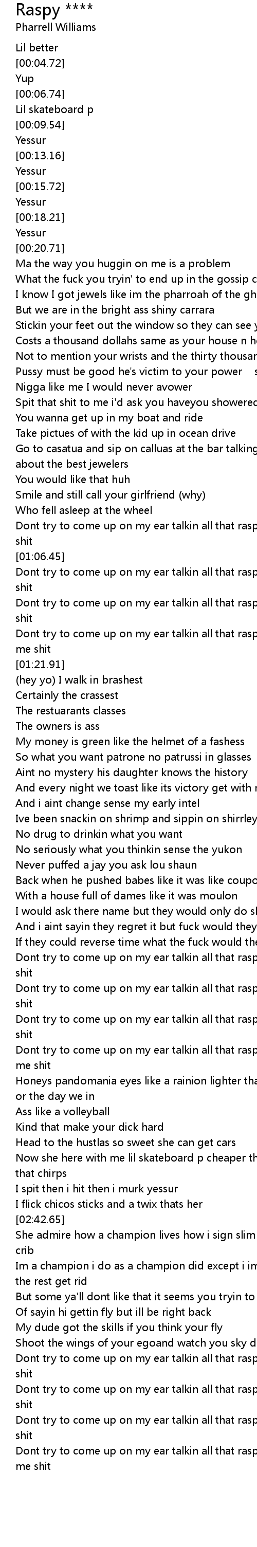 [03:07.93] Dont try to come up on my ear talkin all that raspy shit raspy shit