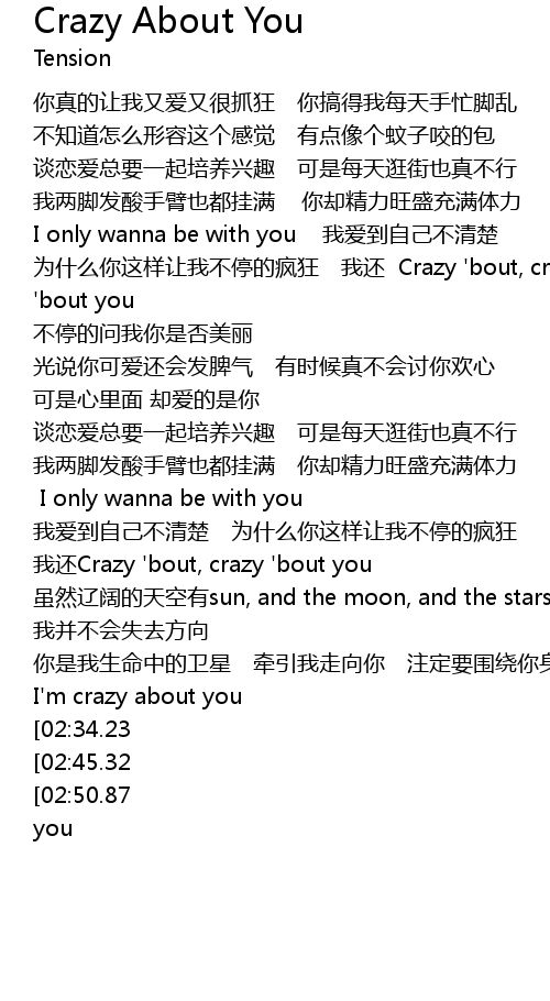 | [03:09.14][02:50.87] | wo hai crazy ' bout crazy ' bout you Crazy ' bout you, about you |