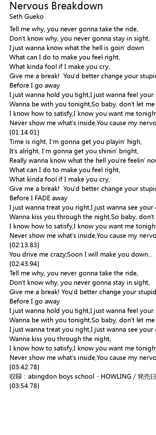 | [01:07.23] | Never show me what' s inside, You cause my nervous breakdown |