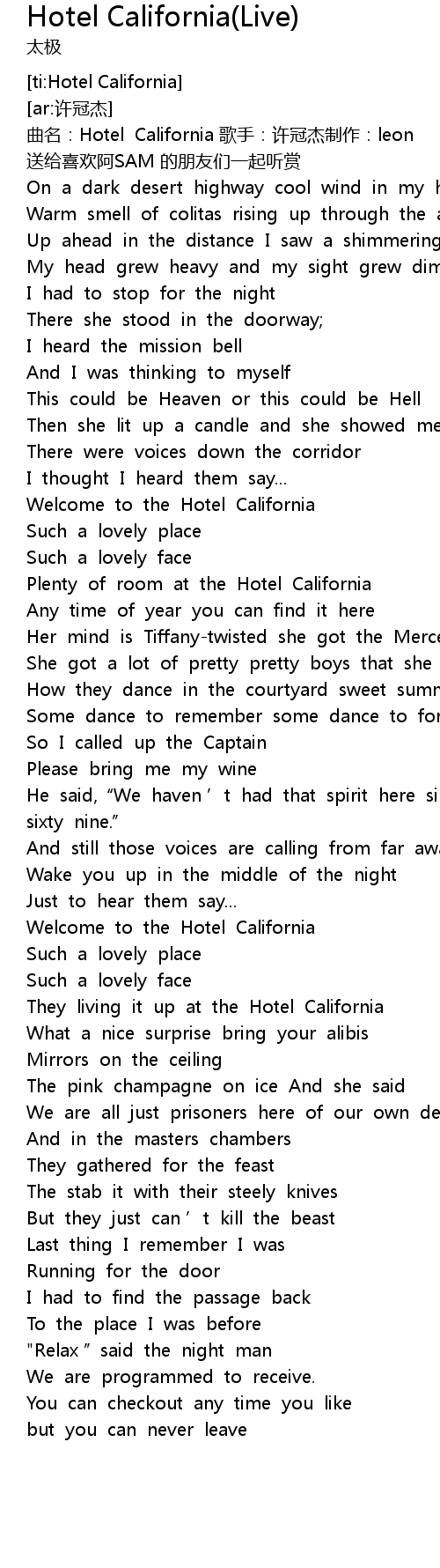 | [00:01.305] | qū míng: Hotel California gē shǒu: xǔ guān jié zhì zuò: leon sòng gěi xǐ huān ā SAM de péng yǒu men yì qǐ tīng shǎng |