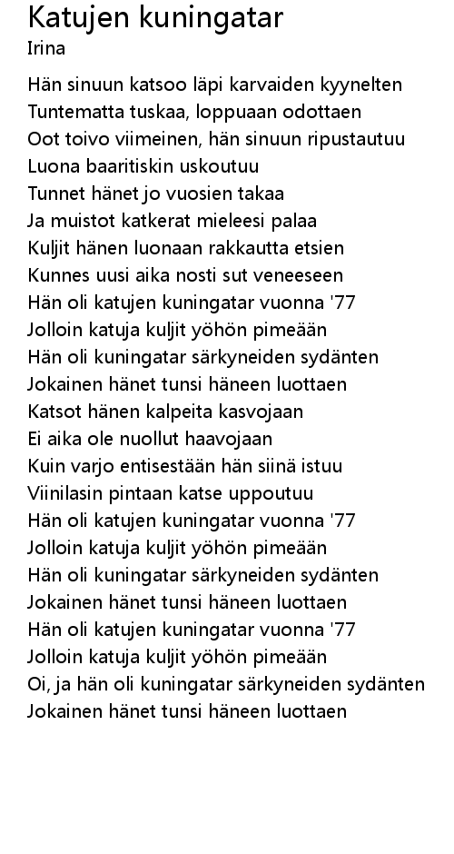 | Oi, ja hän oli kuningatar särkyneiden sydänten | |