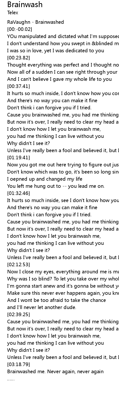 | [03:25.47] | Brainwashed me. Never again, never again |
