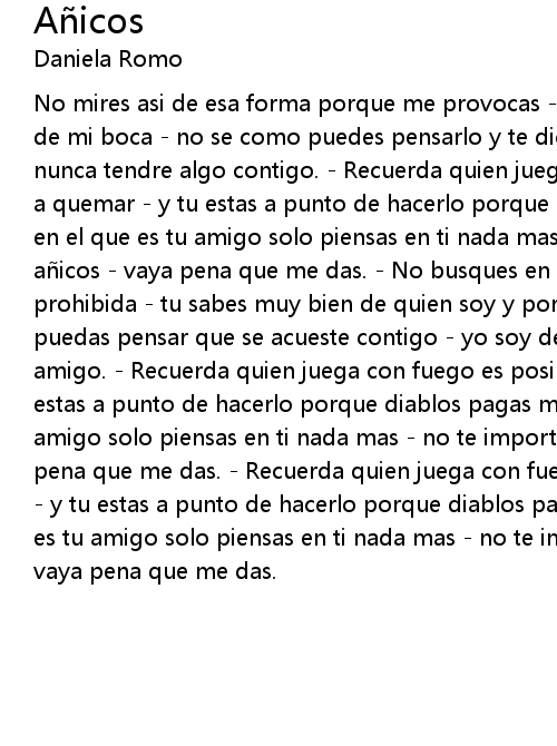 | No mires asi de esa forma porque me provocas no mires asi pretendiendo comer de mi boca no se como puedes pensarlo y te dices amigo entiende ni ahora ni nunca tendre algo contigo. Recuerda quien juega con fuego es posible se llegue a quemar y tu estas a punto de hacerlo porque diablos pagas mal no piensas en el que es tu amigo solo piensas en ti nada mas no te importa que se haga a icos vaya pena que me das. No busques en mi la ocasion de una noche prohibida tu sabes muy bien de quien soy y por el doy la vida no soy la que puedas pensar que se acueste contigo yo soy del amor la mitad y la otra es tu amigo. Recuerda quien juega con fuego es posible se llegue a quemar y tu estas a punto de hacerlo porque diablos pagas mal no piensas en el que es tu amigo solo piensas en ti nada mas no te importa que se haga a icos vaya pena que me das. Recuerda quien juega con fuego es posible se llegue a quemar y tu estas a punto de hacerlo porque diablos pagas mal no piensas en el que es tu amigo solo piensas en ti nada mas no te importa que se haga a icos vaya pena que me das. |