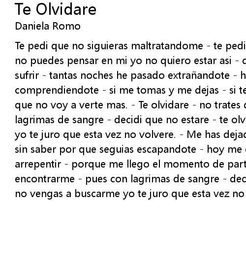 | Te pedi que no siguieras maltratandome - te pedi que no vivieras engañandome - no puedes pensar en mi yo no quiero estar asi - desde que te conoci me haces sufrir - tantas noches he pasado extrañandote - he perdido muchos años comprendiendote - si me tomas y me dejas - si te acercas y te vas - te aseguro que no voy a verte mas. - Te olvidare - no trates de encontrarme - pues con lagrimas de sangre - decidi que no estare - te olvidare - no vengas a buscarme yo te juro que esta vez no volvere. - Me has dejado tantas veces esperandote - sin saber por que seguias escapandote - hoy me quiero despedir - no me voy a arrepentir - porque me llego el momento de partir. - Te olvidare - no trates de encontrarme - pues con lagrimas de sangre - decidi que no estare - te olvidare - no vengas a buscarme yo te juro que esta vez no volvere. |