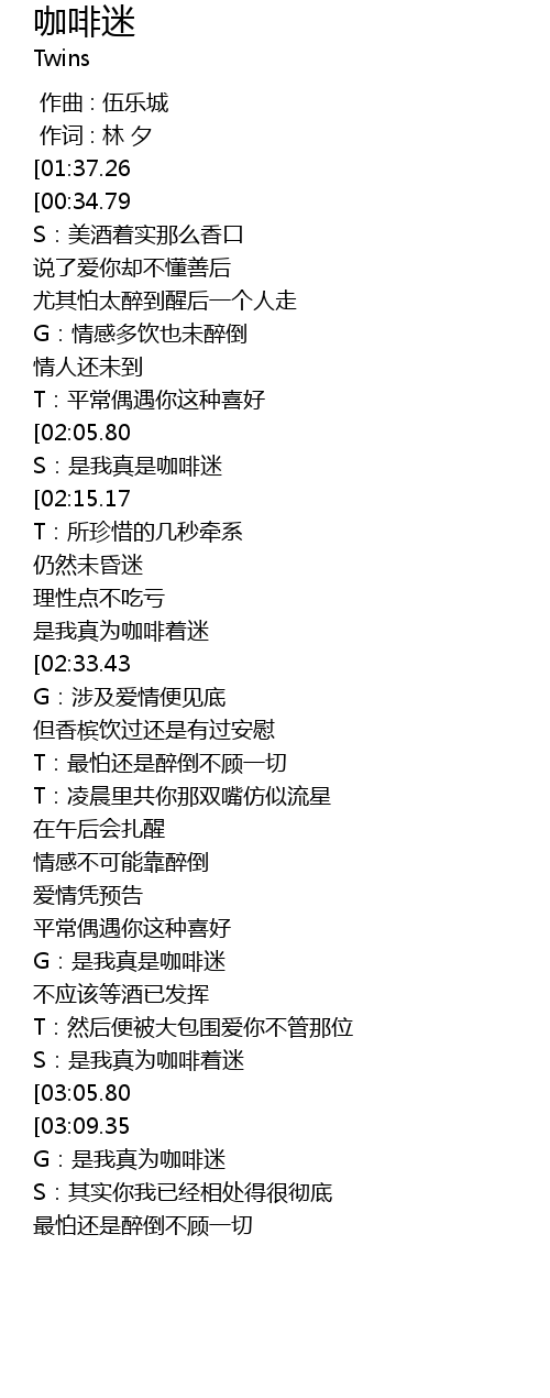 | [00:12.42][01:37.26][02:48.11][03:20.86] | Twins-咖啡迷(粤) |