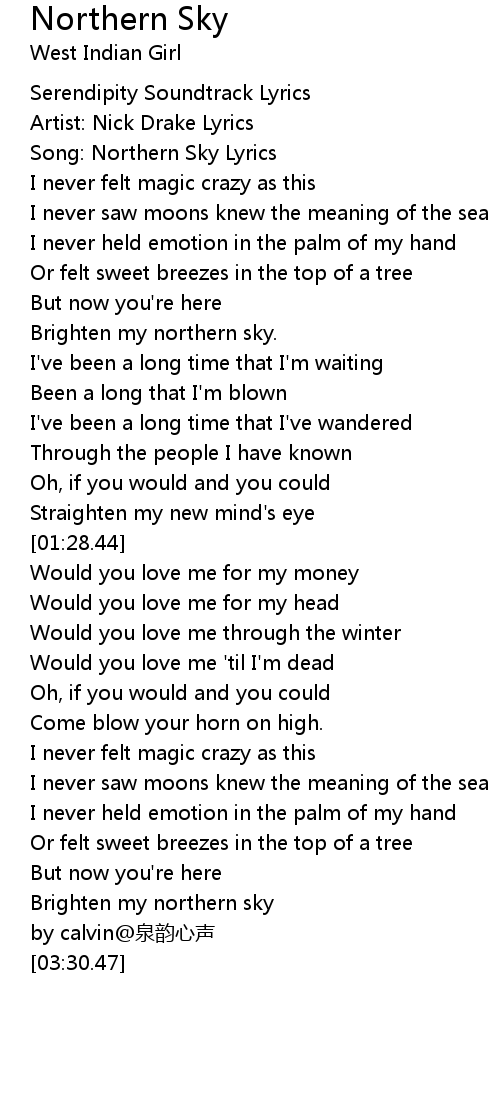 | [00:14.29] | Song: Northern Sky Lyrics |