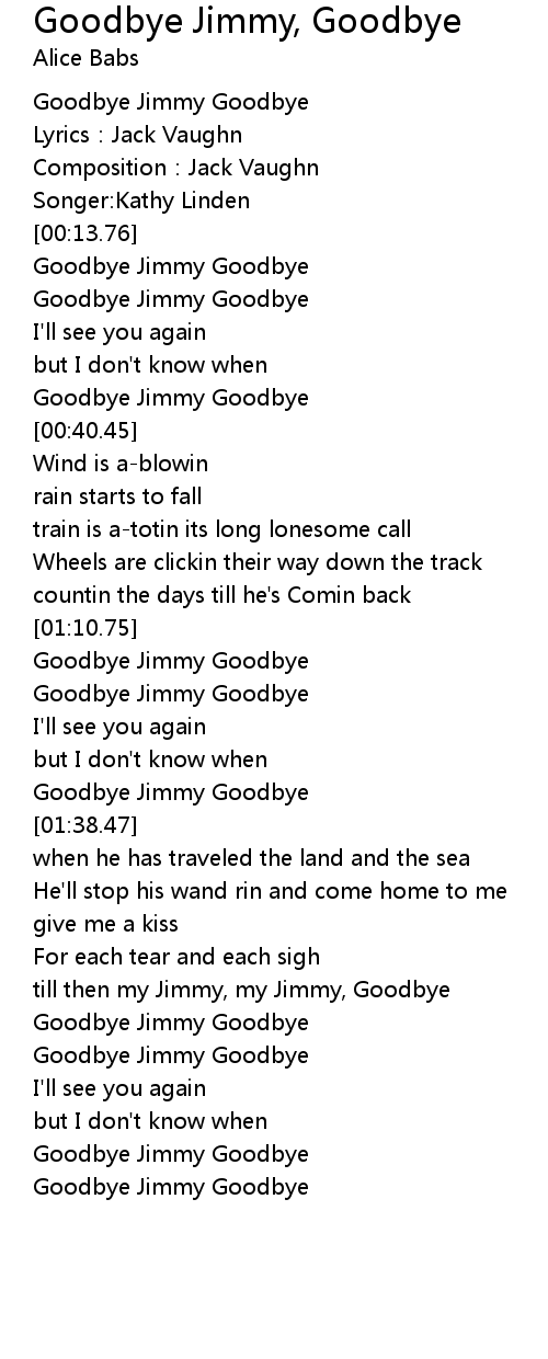 | [01:18.17] | Goodbye Jimmy Goodbye |