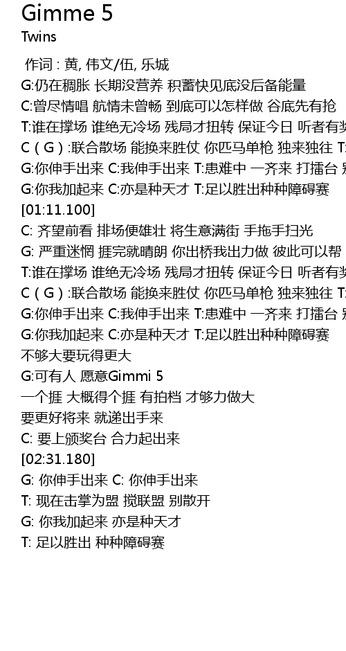 | [01:59.890] | G: ni wo jia qi lai C: yi shi zhong tian cai T: zu yi sheng chu zhong zhong zhang ai sai |
