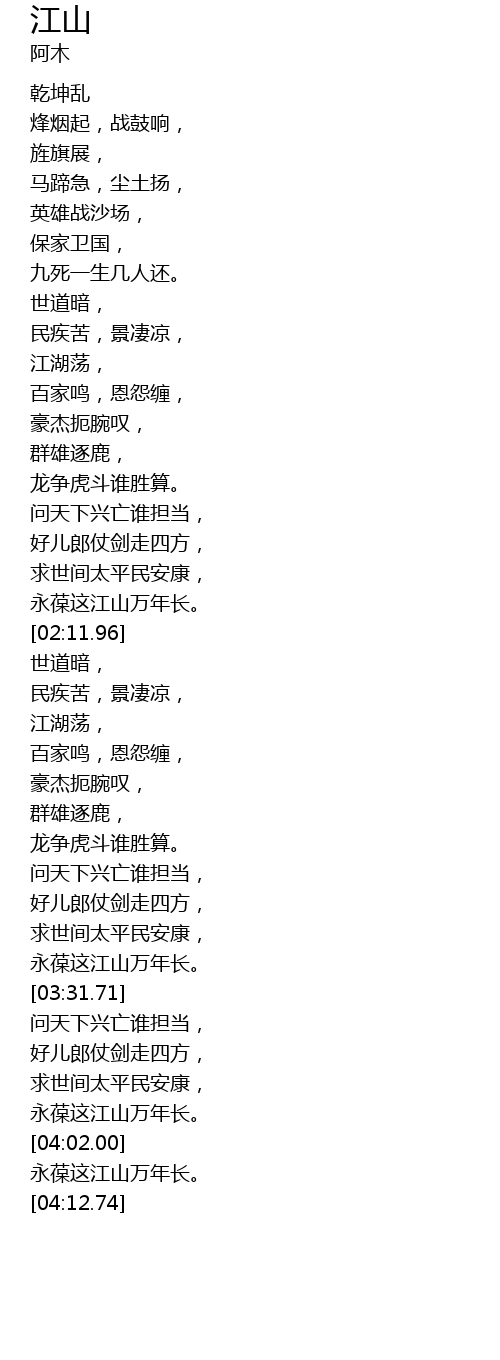 | [04:03.03] | yǒng bǎo zhè jiāng shān wàn nián zhǎng. |