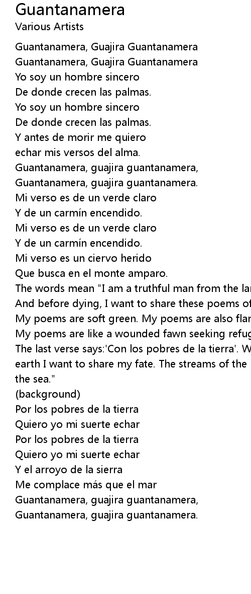 | The last verse says:'Con los pobres de la tierra'. With the poor people of this earth I want to share my fate. The streams of the mountains please me more than the sea." | |
