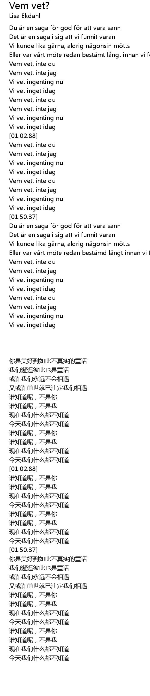| [00:39.53] | Eller var vårt möte redan bestämt långt innan vi fötts |