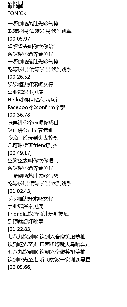 | [00:02.64] | 乾嫁啦喂 清嫁啦喂 饮到跳掣 |