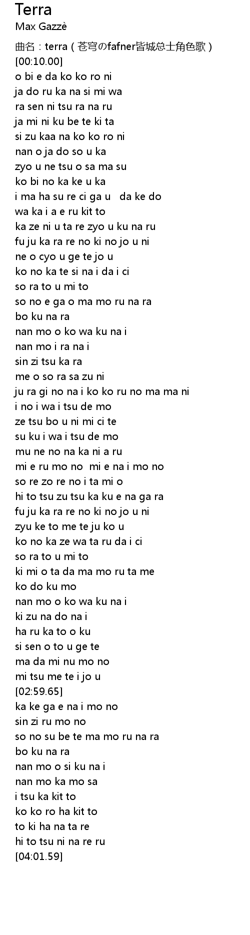 | [00:00.02] | 曲名:terra(苍穹のfafner皆城总士角色歌) |
