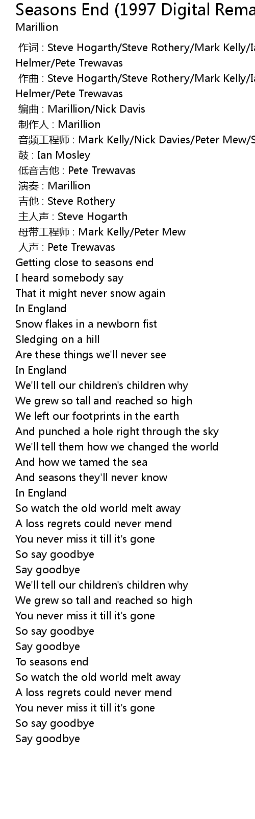 | [00:01.000] | zuò qǔ : Steve Hogarth Steve Rothery Mark Kelly Ian Mosley John Helmer Pete Trewavas |
