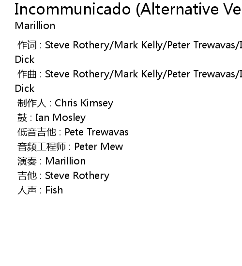 | [00:00.000] | 作曲 : Steve Rothery/Mark Kelly/Peter Trewavas/Ian Mosley/Derek Dick |