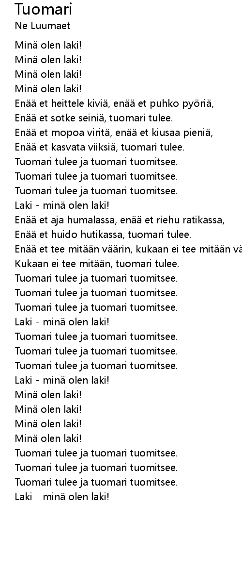 | Enää et mopoa viritä, enää et kiusaa pieniä, | |