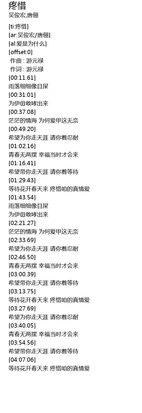 | [04:08.19] | 等待花开春天来 疼惜咱的真情爱 |