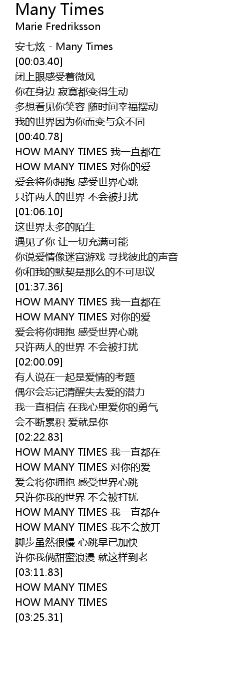 | [00:46.47] | HOW MANY TIMES dui ni de ai |