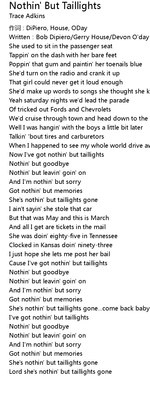 | She' s nothin' but taillights gone... come back baby | |