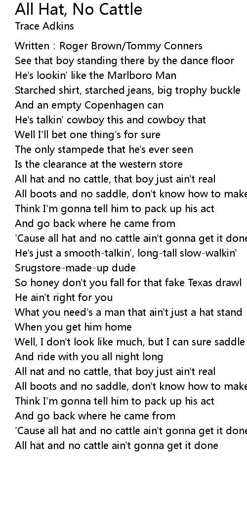 | ' Cause all hat and no cattle ain' t gonna get it done | |