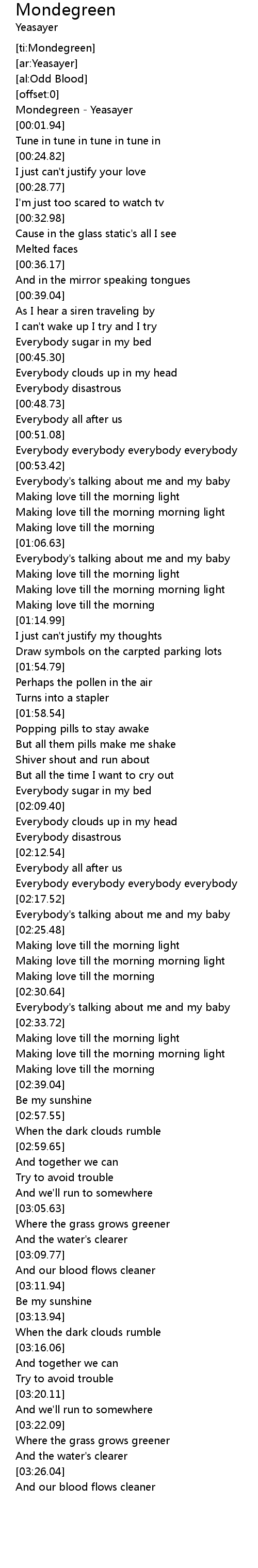 | [00:00.72] | Mondegreen - Yeasayer |