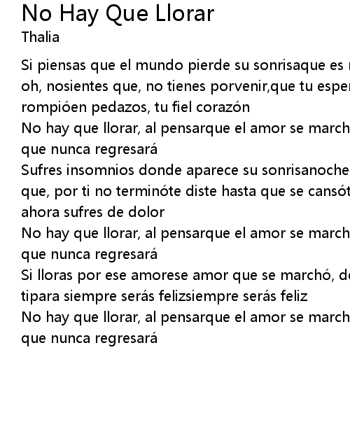 | No hay que llorar, al pensarque el amor se marchará no hay que sufrir, al sentir que nunca regresará |