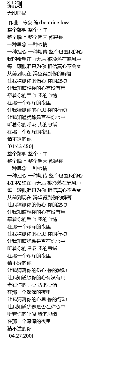 | [03:45.000] | ràng wǒ cāi cè nǐ de xīn sī nǐ de xíng dòng |