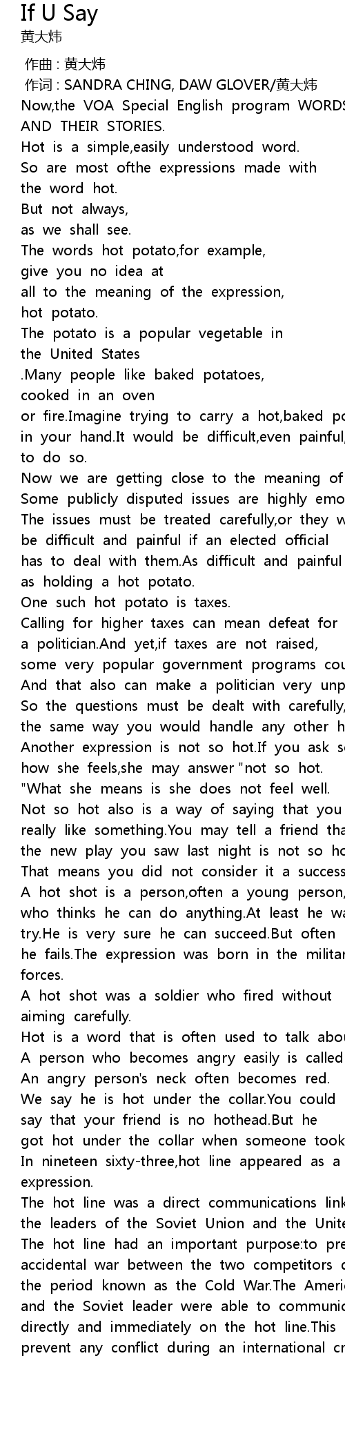 | [00:33.527] | The words hot potato,for example, |