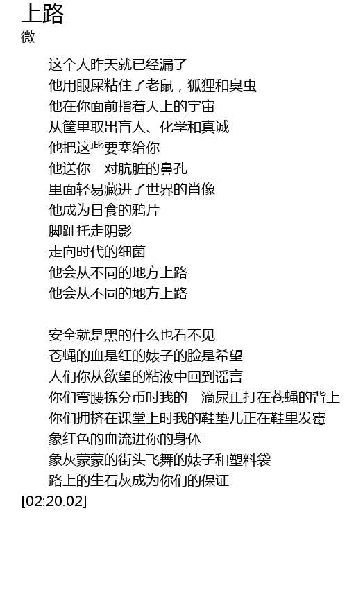 | [01:37.90] | 你们弯腰拣分币时我的一滴尿正打在苍蝇的背上 |