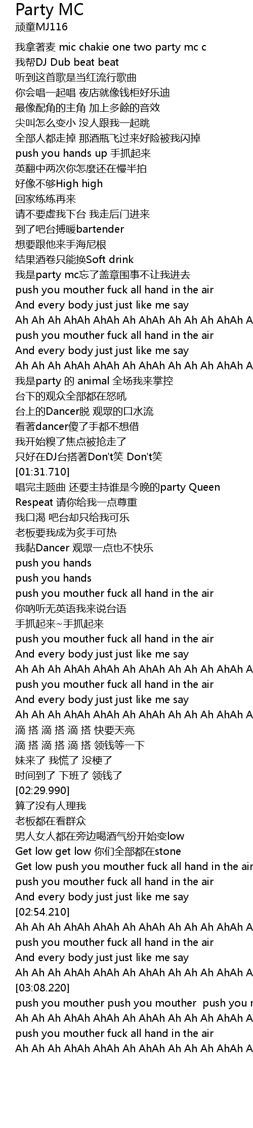 | [03:08.740] | push you mouther push you mouther push you mouther hand in the air |