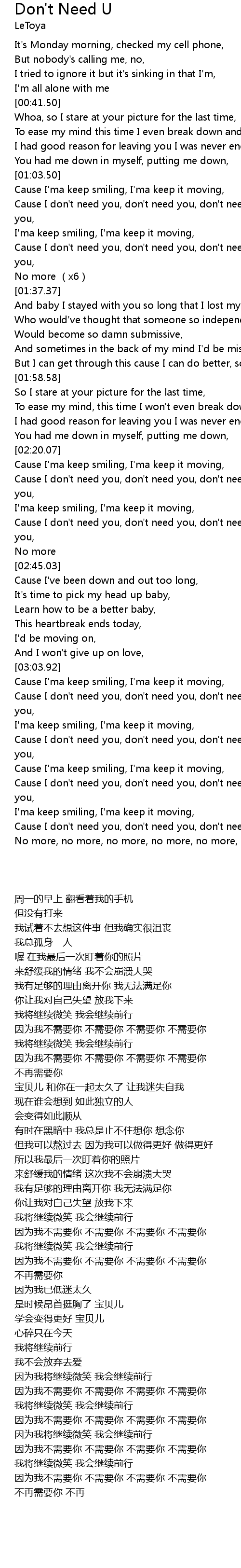 | [03:42.11] | Cause I don' t need you, don' t need you, don' t need you, don' t need you |
