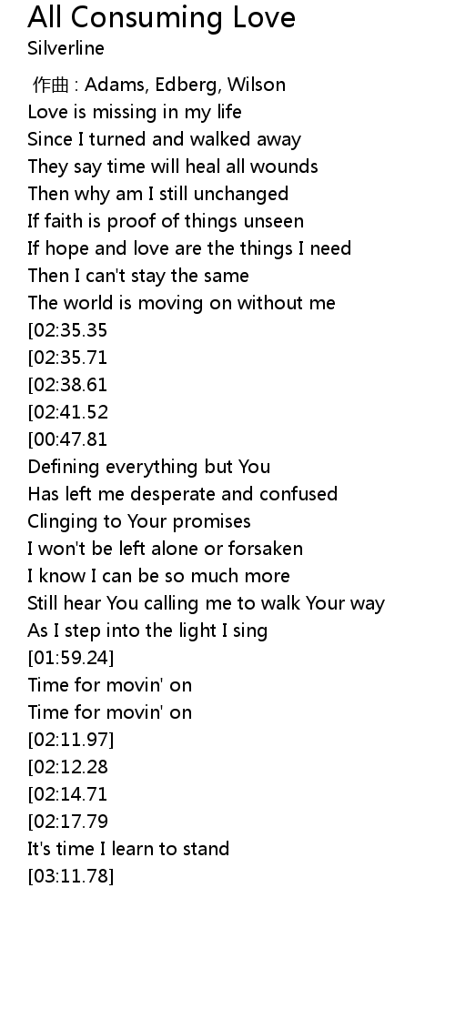 | [02:53.71][02:41.52][01:54.15][01:42.66][00:54.85][00:43.00] | All consuming love |