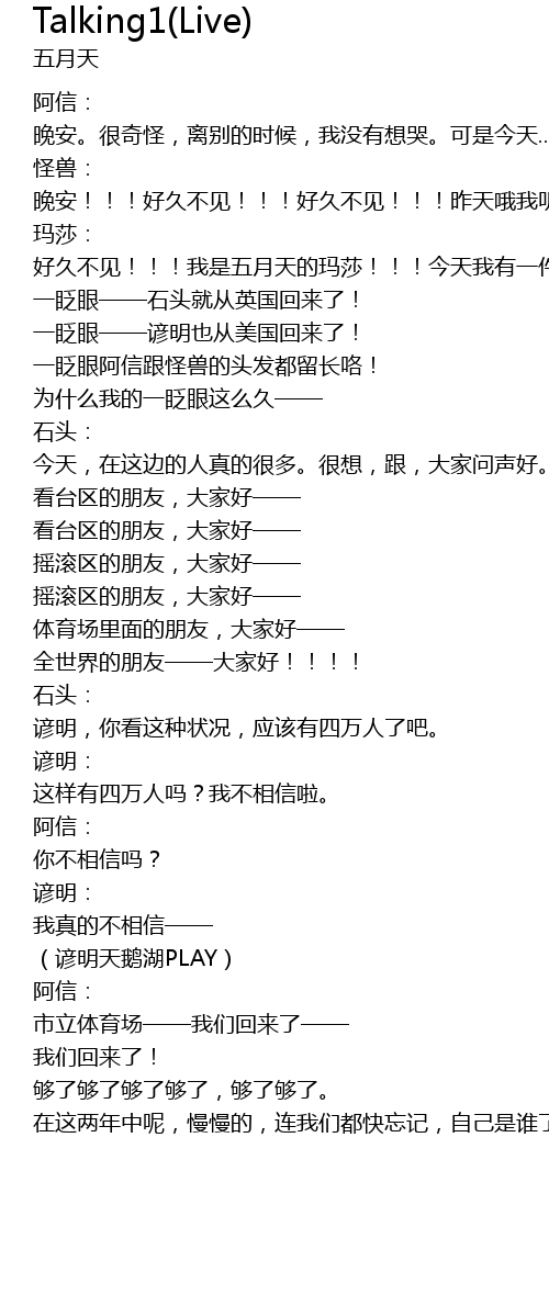 | 晚安!!!好久不见!!!好久不见!!!昨天哦我听说已经有一万人在外面排队哦昨天晚上,我现在要跟大家讲的是——你们会不会太OVER了!!!五月天爱你们!!! | |