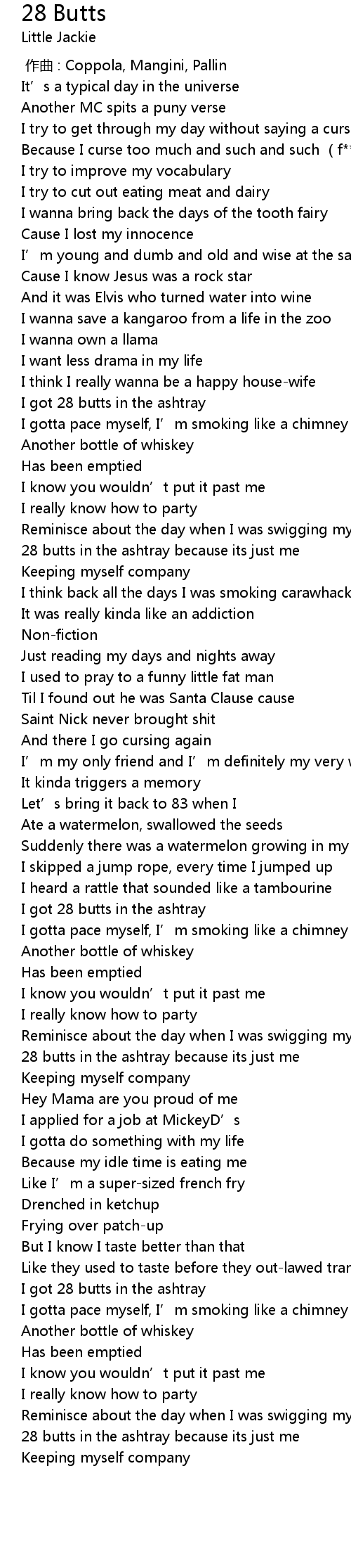 | [00:57.40] | 28 butts in the ashtray because its just me |