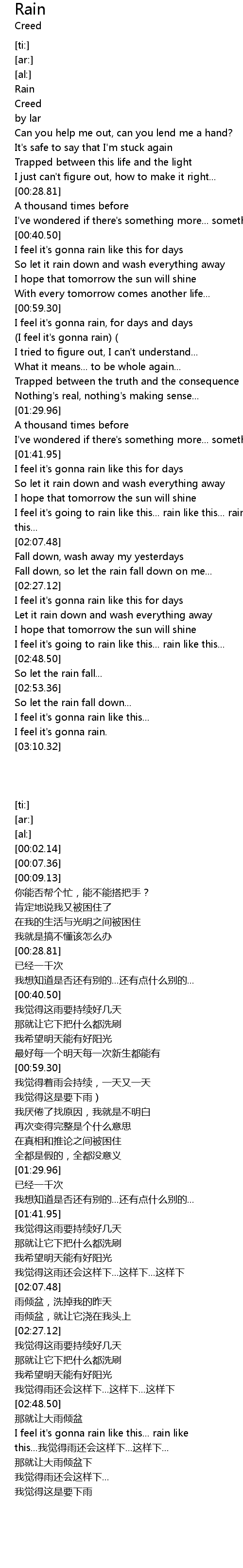 | [02:17.96] | Fall down, so let the rain fall down on me... |