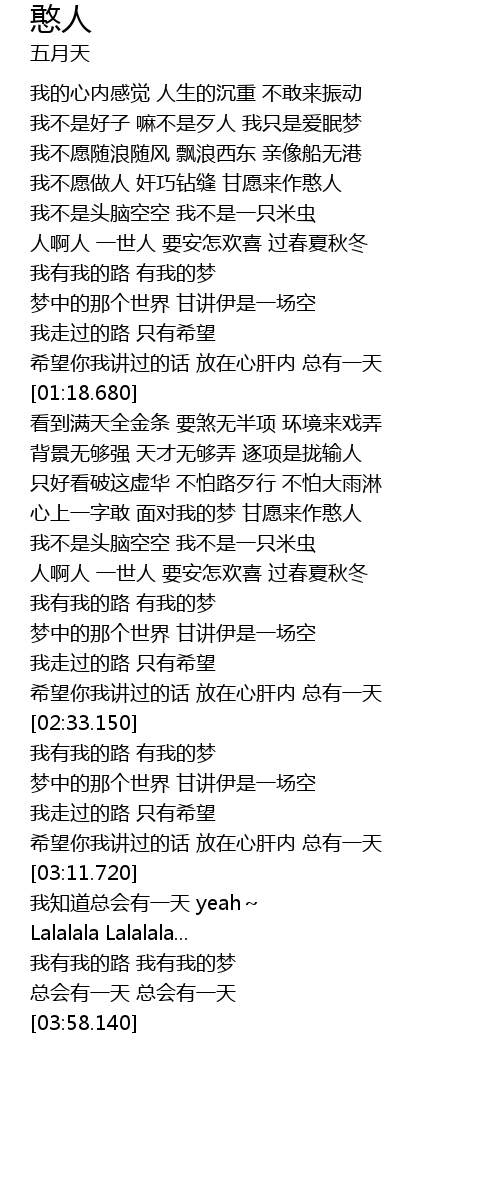 | [01:44.100] | 心上一字敢 面对我的梦 甘愿来作憨人 |