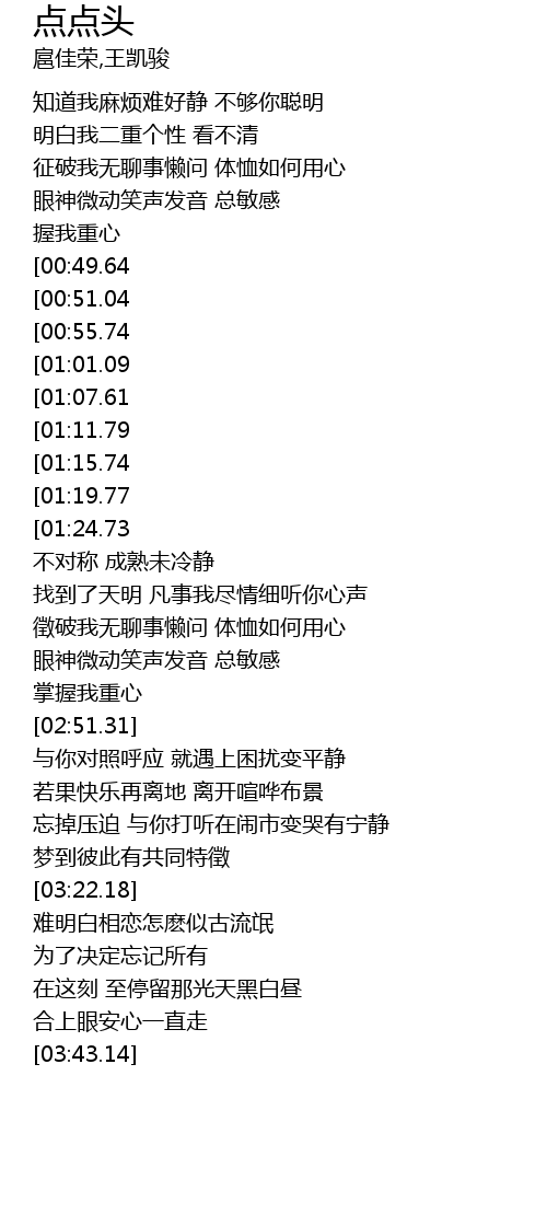 | [02:17.21][00:51.04] | 无疑问 只需点点我的眉头 |