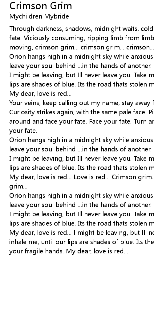 I might be leaving, but Ill never leave you. Take me in, inhale me, until our lips are shades of blue. Its the road thats stolen me, from your fragile hands. My dear, love is red... Love is red... Crimson grim... Crimson grim... Crimson grim... |