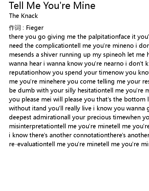 | there you go giving me the palpitationface it you're finenow you know i don't need the complicationtell me you're mineno i don't fear it when you're near mesends a shiver running up my spineoh let me hold you now i've told youwhat you wanna hear i wanna know you're nearno i don't know nothing about your reputationhow you spend your timenow you know i don't need the aggravationtell me you're minehere you come telling me your reservationhanding me the linedon't be dumb with your silly hesitationtell me you're mineoh please don't tease me if you please mei will please you that's the bottom lineno don't you doubt it live without itand you'll really live i know you wanna give meall your love all your deepest admirationall your precious timewhen you're done with your misinterpretationtell me you're minetell me you're minewhoa ho ho ho ho ho honow i know there's another connotationthere's another rhymeif you go for a re-evaluationtell me you're minetell me you're minetell me you're mine |