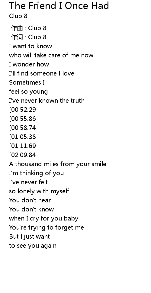 | [02:35.67][02:09.84][01:15.39] | the friend I once had |