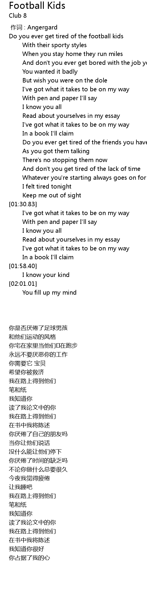 | [00:06.77] | Do you ever get tired of the football kids |