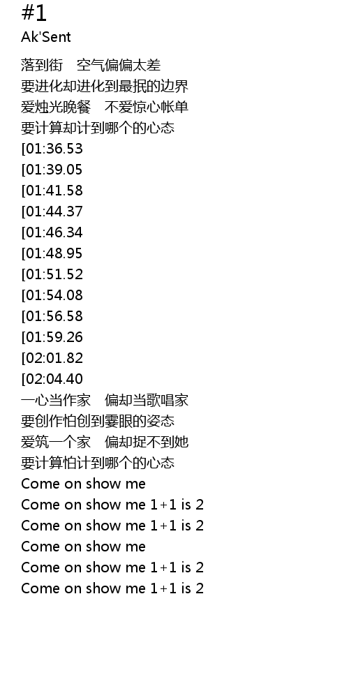 | [03:11.91][01:48.95][00:46.63] | Come on show me 1+1 is 2 |