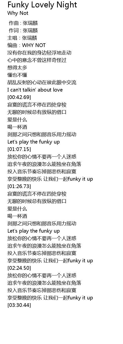 | [03:24.09] | xiǎng shòu zhěng wǎn de kuài lè ràng wǒ men yì qǐ funky it up |