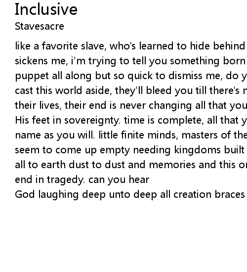 | like a favorite slave, who's learned to hide behind the chains your presence sickens me, i'm trying to tell you something born into your bonds, played the puppet all along but so quick to dismiss me, do you even know what's out there? cast this world aside, they'll bleed you till there's nothing left, no limits to their lives, their end is never changing all that you can see, kneels at | |