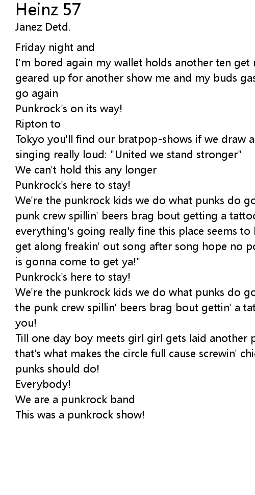 We're the punkrock kids we do what punks do go to punk shows hang out with the punk crew spillin' beers brag bout getting a tattoo hope we can count on you! everything's going really fine this place seems to blow my mind glad to see you get along freakin' out song after song hope no posers show or "the bones brigade is gonna come to get ya!" |