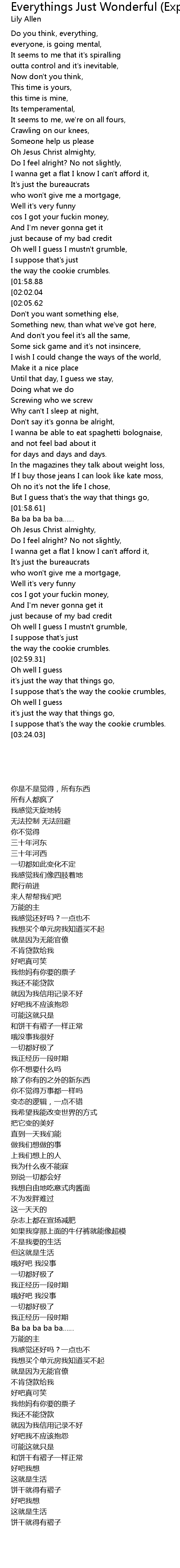 | [02:14.39][02:02.04][01:01.10] | Everything' s just wonderful, |