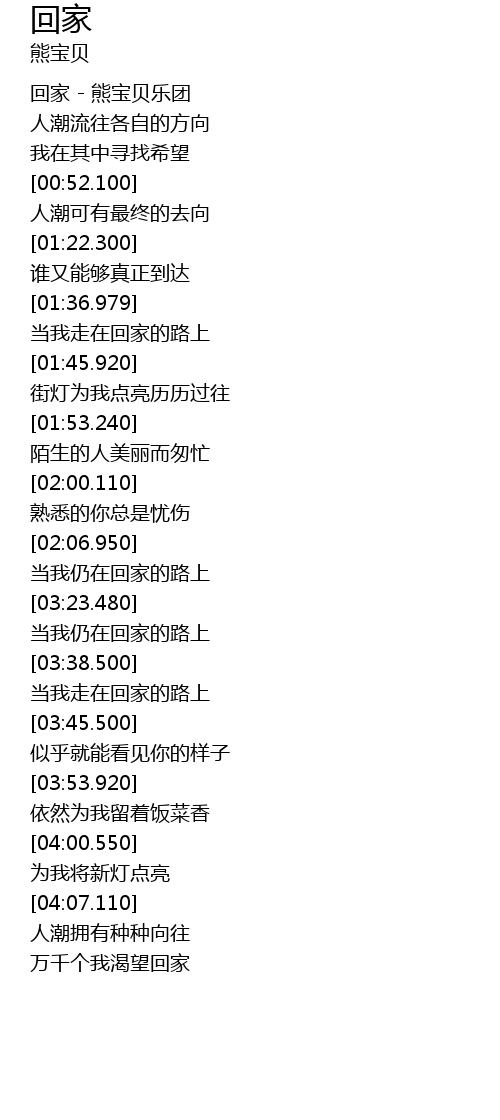 | [00:01.340] | 回家 - 熊宝贝乐团 |