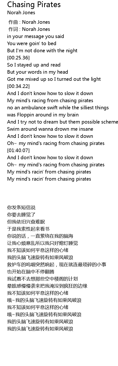 | [00:44.03] | My mind' s racing from chasing pirates |