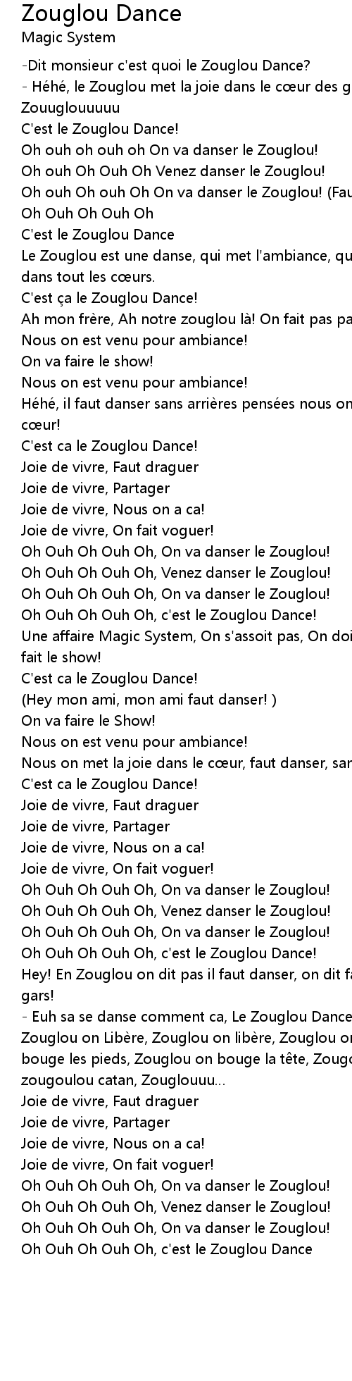 | Oh ouh Oh ouh Oh On va danser le Zouglou! Faut danser le Zouglou | |